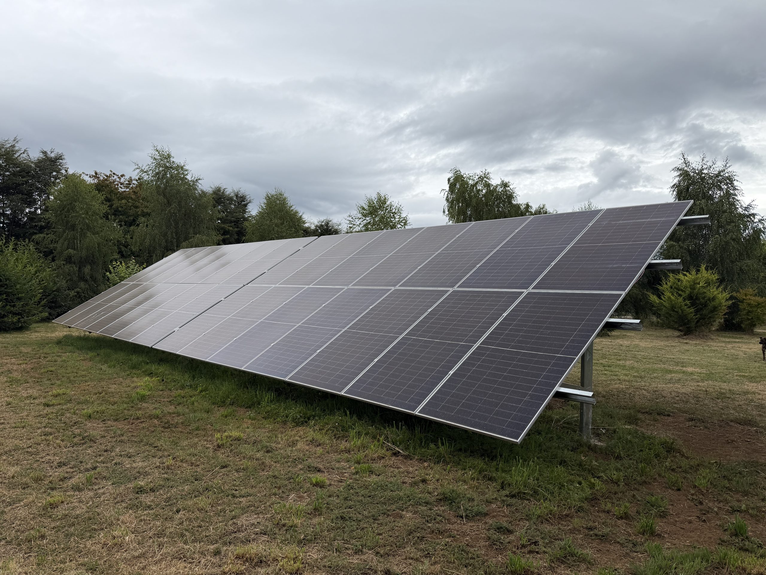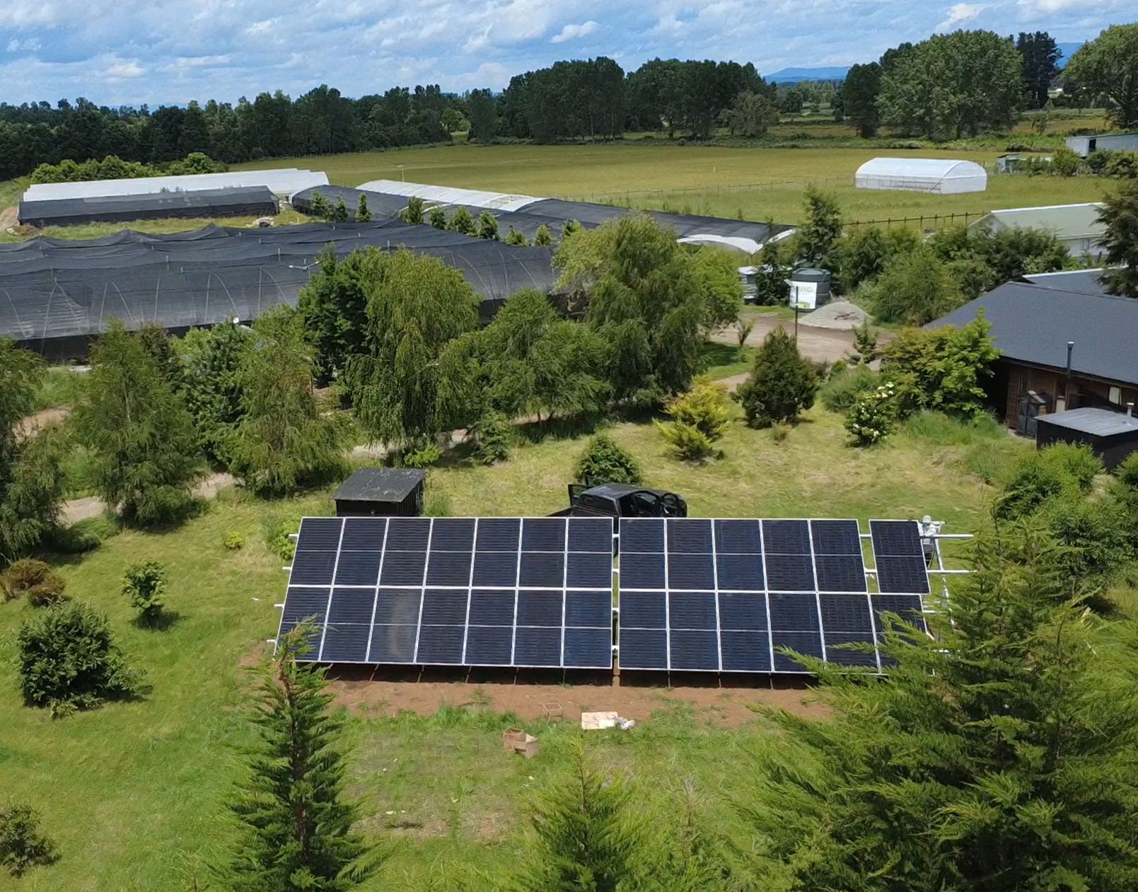 Sistema conectado a la red sin baterías, compuesto por 28 paneles bifaciales de 585 W instalados en una estructura fija en suelo que entrega una potencia nominal máxima de salida de 12kW. Esta empresa, que anteriormente pagaba aproximadamente CLP $450.000 mensuales en electricidad, se espera que reduzca sus cuentas en un 95%, logrando un ahorro anual estimado de CLP $4.400.000. La ubicación de los paneles fue cuidadosamente diseñada para maximizar el rendimiento del sistema y minimizar el impacto estético del vivero.